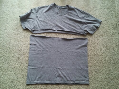 One of the best things about these towels is that they are easy and cheap to make. All you need is an old t-shirt and a pair of scissors. First cut the shirt straight across at the armpit