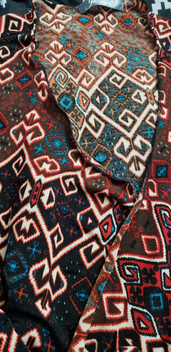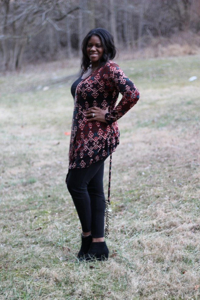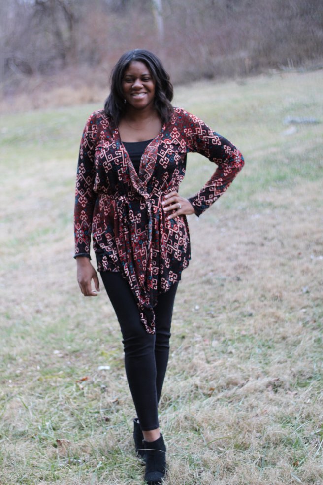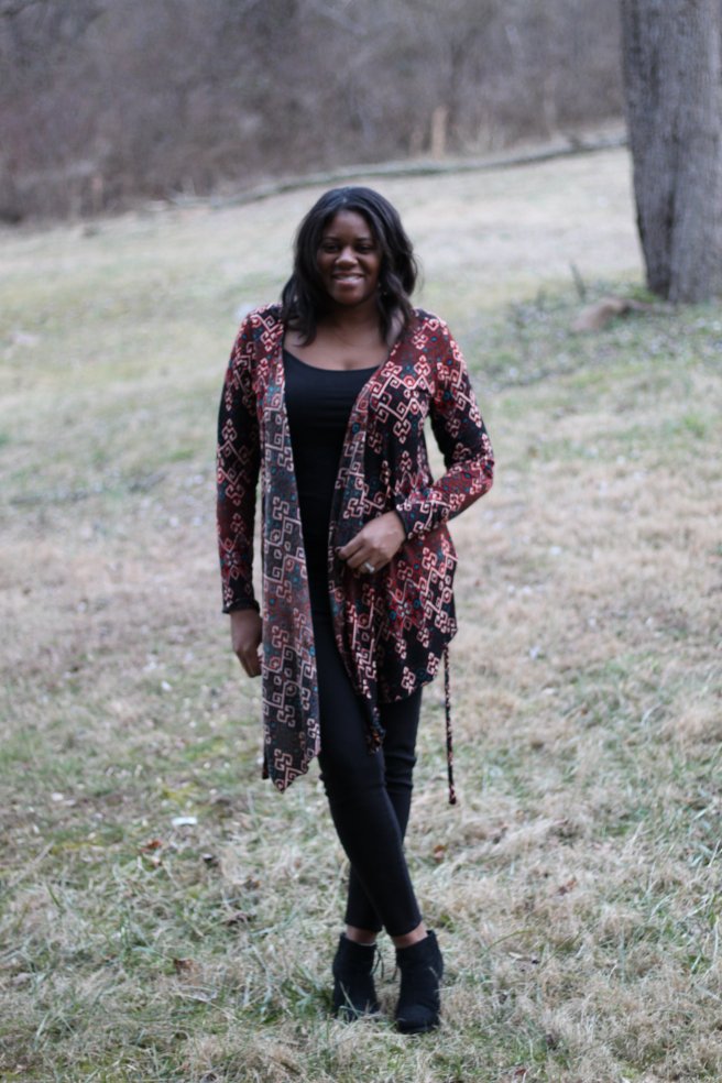 I wanted another cardigan and paired the two together. I was terrified I wasn’t going to like it and would end up giving it away or it sit in my closet. So glad I went out on a limb here. I also added a tie to pull in the waist to give me some shape. The tie is 60″ by 2″, sewn with a 1/4″ seam allowance.