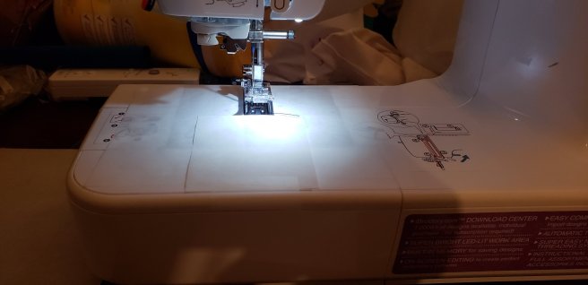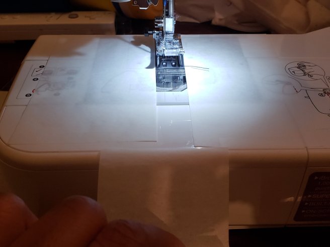 The fabric kept snagging when I would try to slide it under the presser foot. I taped some tracing paper surrounding the feed dog to help it slide under the foot.