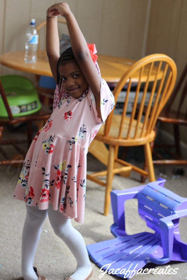 Ellie and Mac’s School Cool Dress and Tunic is beautiful with its fluttered sleeve option. I made the dress and cut off 3 1/2 inches from the hem. It was a little too long for my taste. It hit right below the knee on my daughter. I like dresses and skirts to come at the knee or a little above it on my girls. When I took off those 3 1/2 inches the dress perked right up. I did not finish the hems on the skirt or sleeves, just left them raw. That gave it a light whimsical feel.