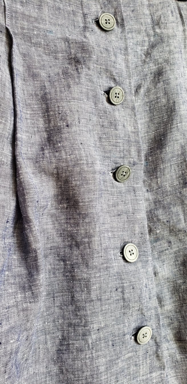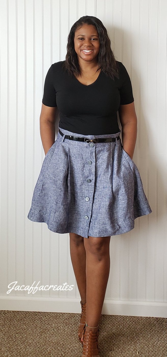 I love the silhouette of this skirt. I instantly knew I wanted to make it and blindly over looked that I would have to sew button holes! I got myself together and put on my JUST DO IT attitude, purchased a denim looking linen (I think) from Joanns and got it done. It actually wasn’t that bad. The button holes are a little wonky but it’s wearable…yay!