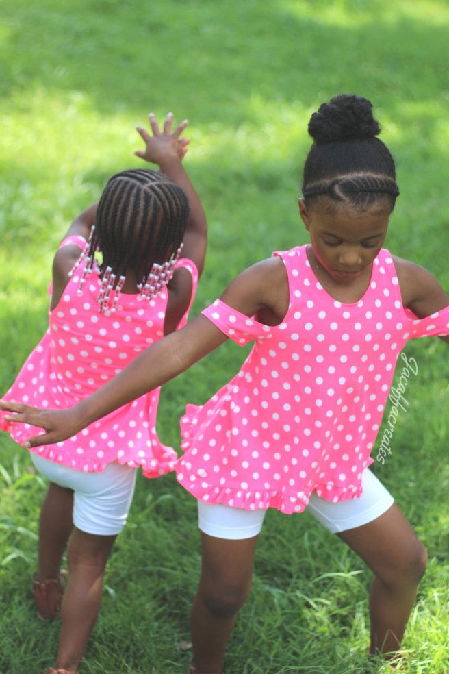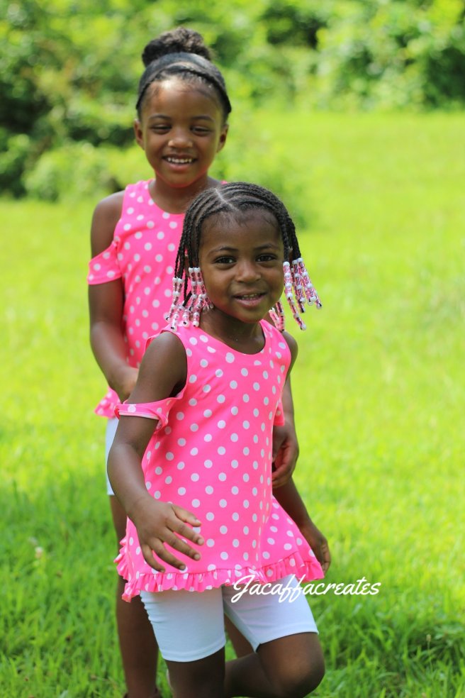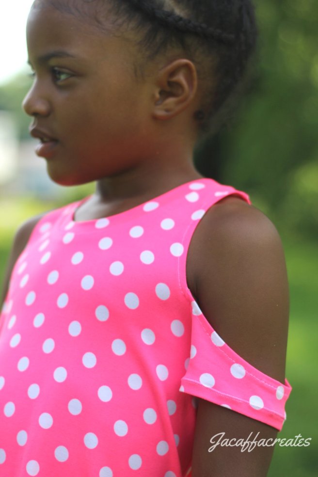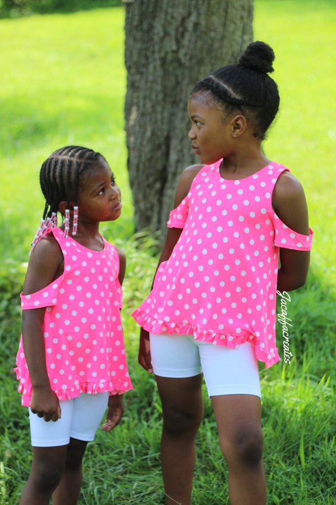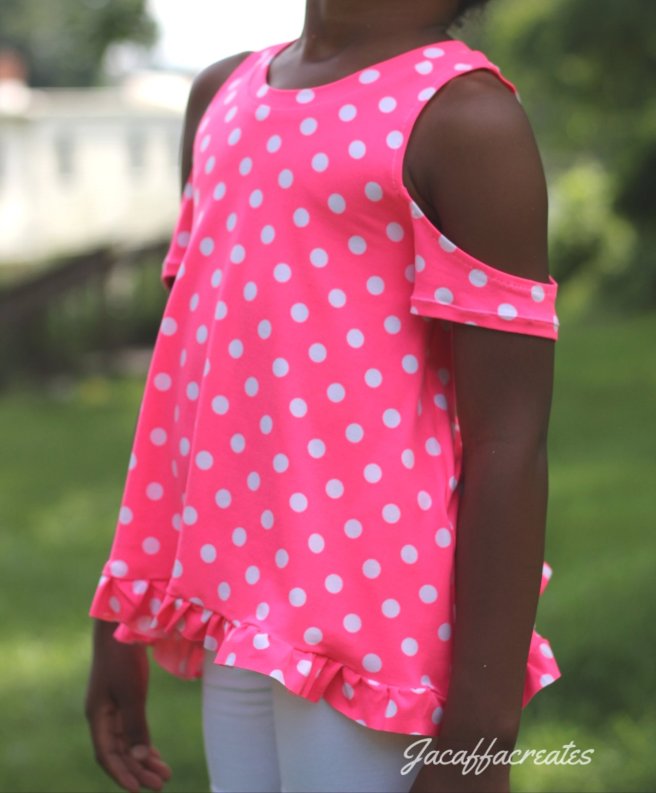Since I have been back, I’ve been working on sewing up some promo fabric from Mily Mae Fabrics. I got the Neon Dotty, a double brushed polyester (which of course my girl’s claimed). They coined it the Minnie Mouse, I can totally see that. I purchased the Girls Cold Shoulder Top from Ellie and Mac on one of their Wack Wednesday sales. I had just enough fabric to make two tops out of a yard and half of fabric.
