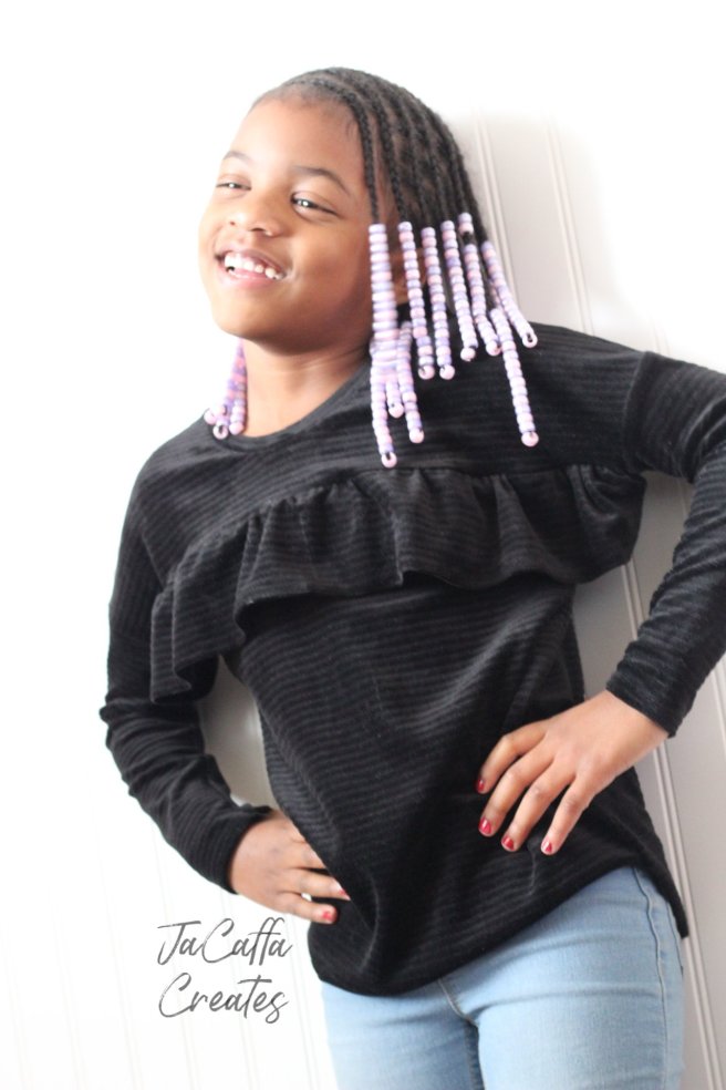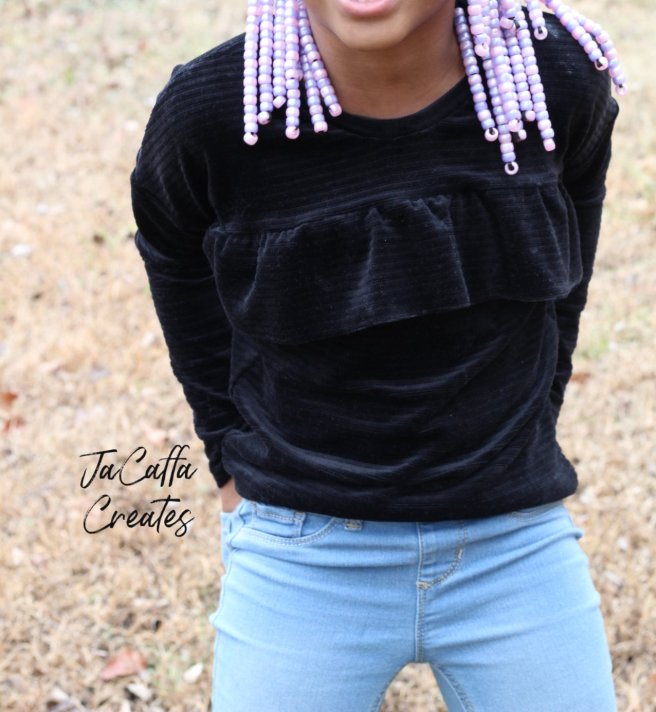 The corduroy to my surprise worked really well for this pattern. My oldest loved how soft was and she didn’t have any restrictions in movement. It’s a wide knit corduroy that kinda of reminds me of velvet. I could so see this as an elegant dress, as well.