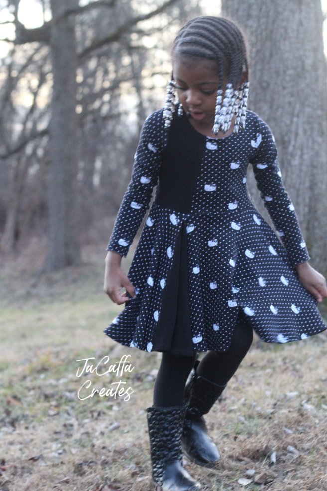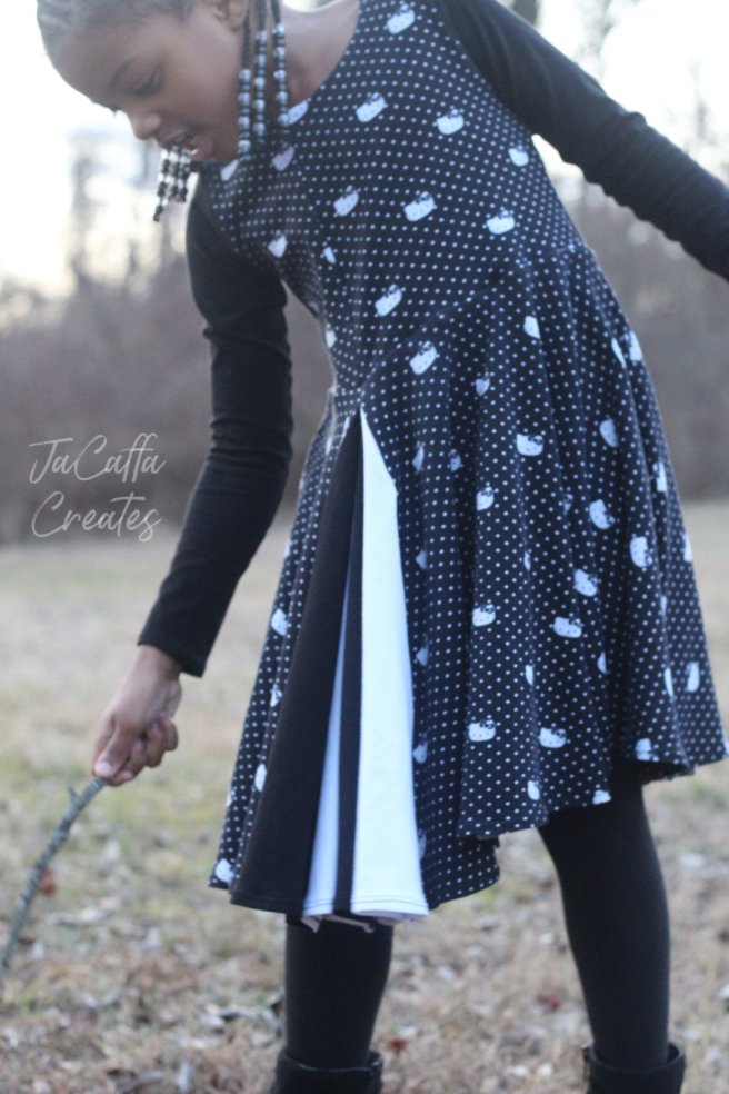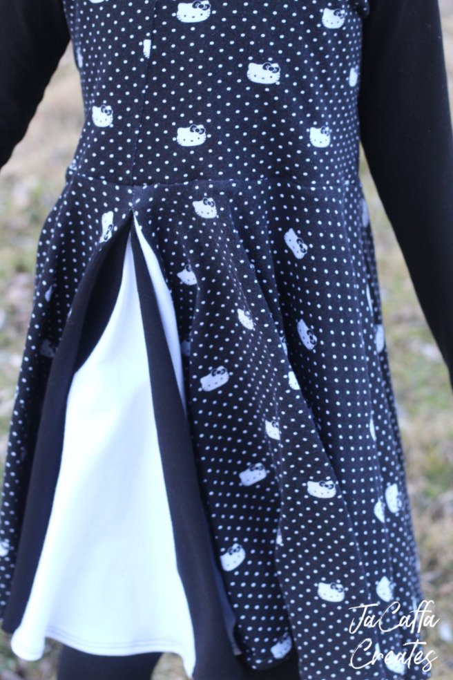 The Twirl Magic Dress features a lined bodice with the option of sleeveless, short or long sleeves.