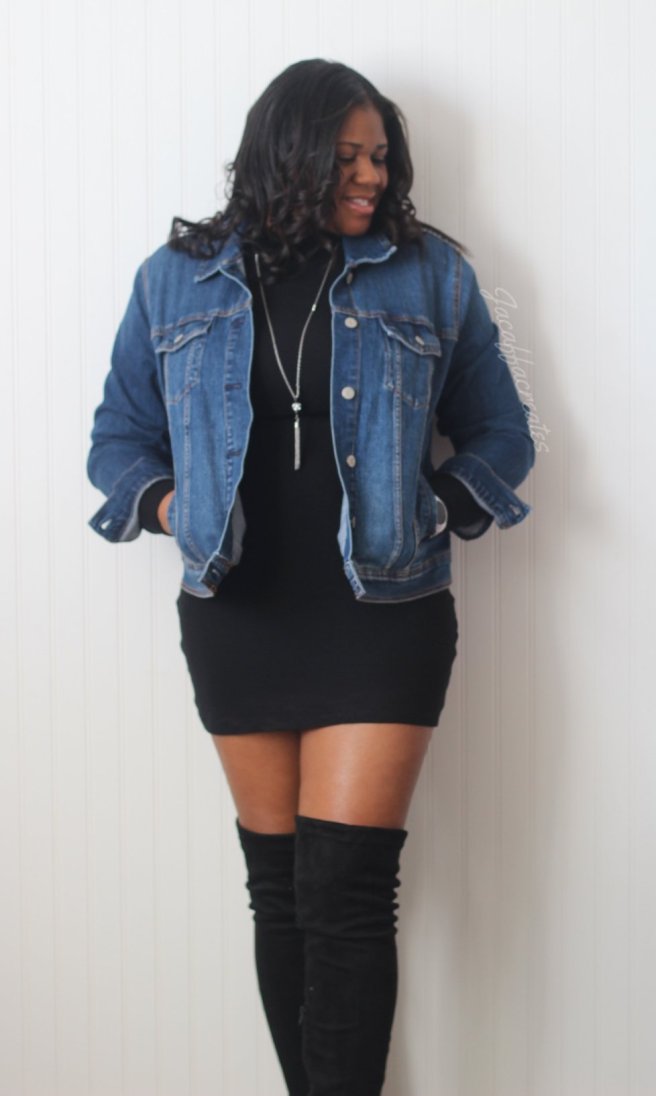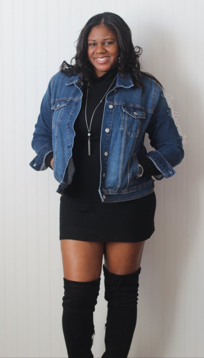 I styled the dress with an Old Navy denim jacket, over the knee boots from Amazon and a long necklace.