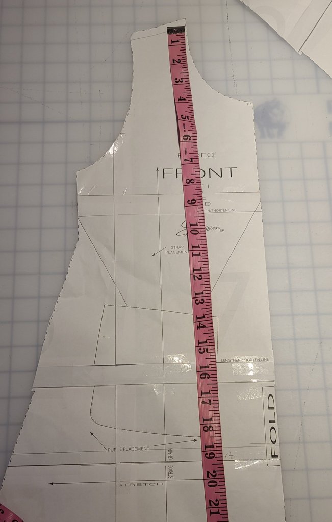 On the patterns front and back pieces measure from the inner shoulder point down to that desired measurement. Mark the seam allowance on the shoulder and add your hem allowance to the desired length.